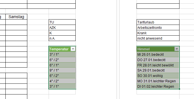 Wie kann ich das also am besten lösen, mir reicht es wenn in einer Spalte die Temperatur steht und in der anderen ob es an dem Tag regnet oder Trocken ist und immer eine 5-7 Tages Vorschau. Und da ich NUR diesen Platz auf dem Tabellenblatt zur Verfügung habe weis ich nicht wie ich das löse so das auch das Wetter immer aktuell ist auf dem Blatt.
