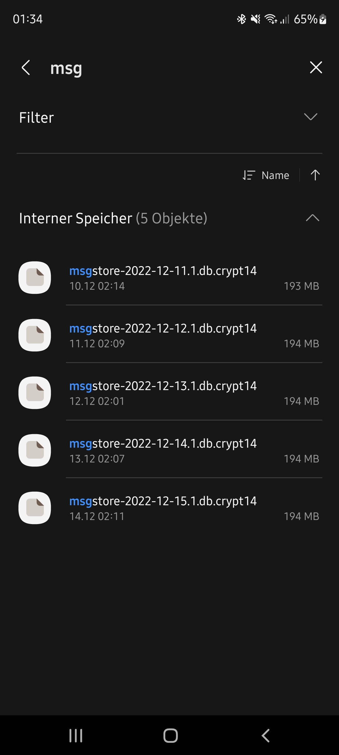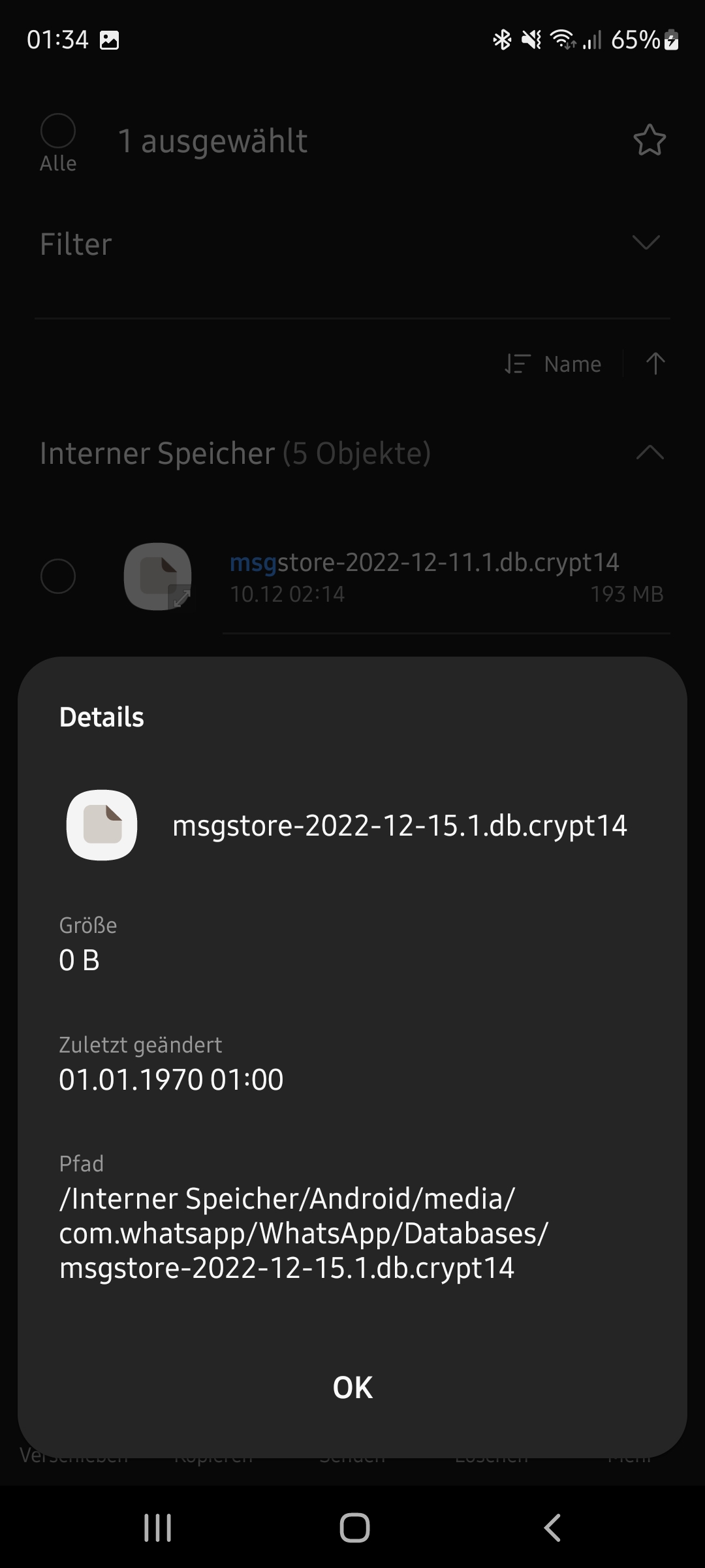 Auf der Suche nach Lösungen bin ich im Internet über die Backup Dateien gestoßen welche WhatsApp selbst macht. Diese sind aber nur noch Imaginär vorhanden. ---> siehe Bilder