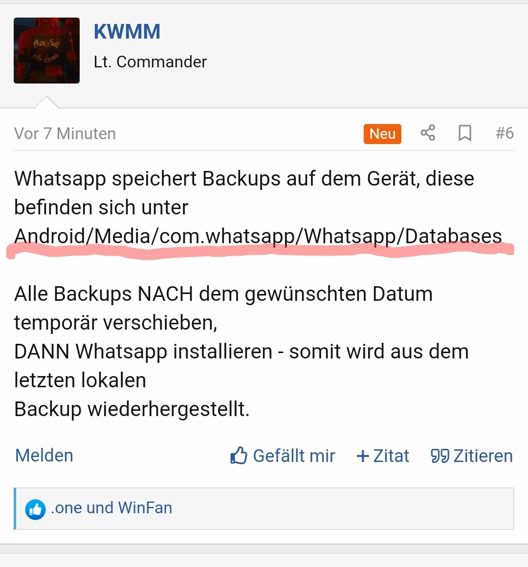 Am Ende müsste also nur noch eine Datei im Ordner sein. Whatsapp löschen und wieder installieren. Nun müsste es eigentlich geklappt haben. Vielleicht kann der eine oder andere hier sagen ob es soweit korrekt ist wie von mir beschrieben.