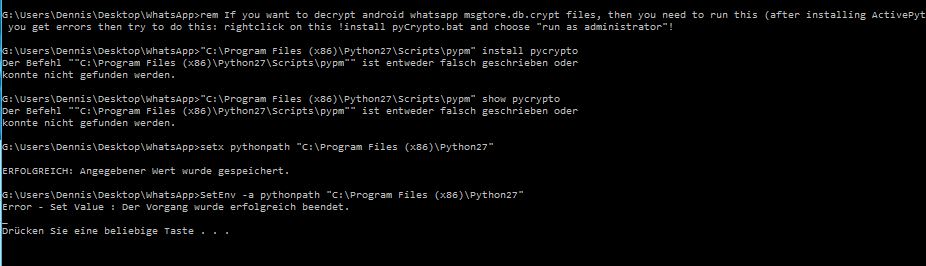 Wie beschrieben habe ich den WhatsApp-Xtract_Archivinhalt in einen seperaten Ordner auf dem Desktop kopiert. Anschließend habe ich ActivePython unter C/Programme(86) installiert. Mein Betriebssystem ist übrigens Windows 10 - 64 bit. Leider bekomme ich folgendes Fehlerbild wenn ich versuche die Datei (installpyCrypto.bat) auszuführen :