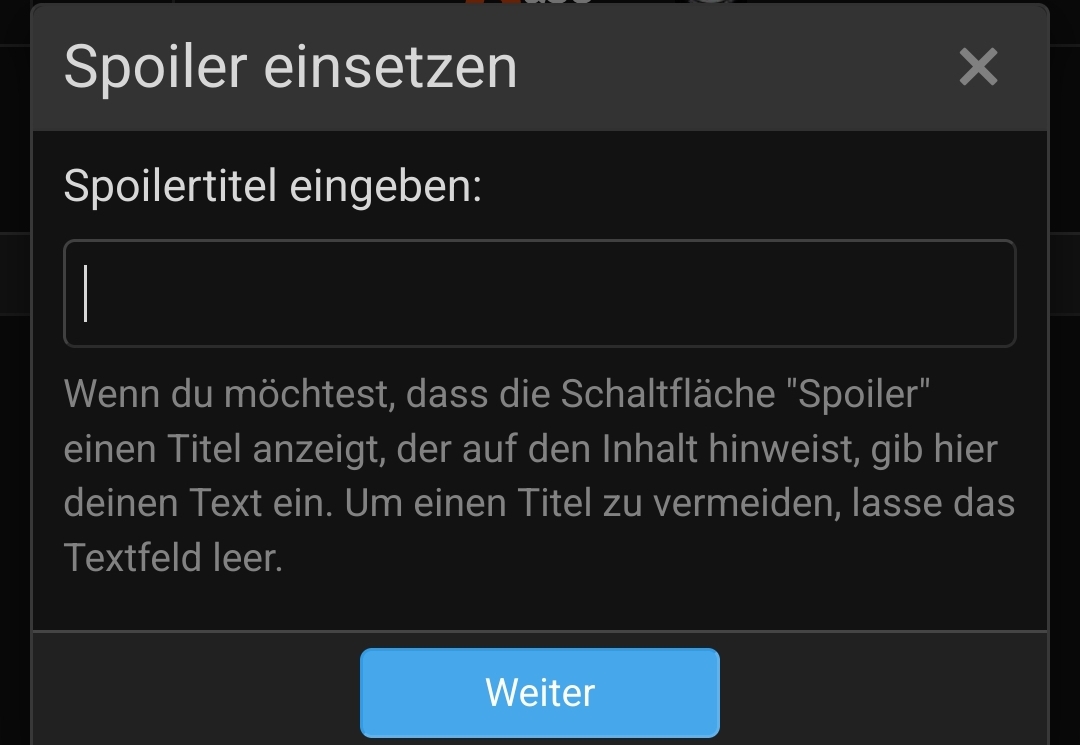Ein Spoiler muss einen Inhalt haben. Ein Spoiler kann einen eigenen Titel haben, wenn der nicht definiert ist ist der einfach "Spoiler"