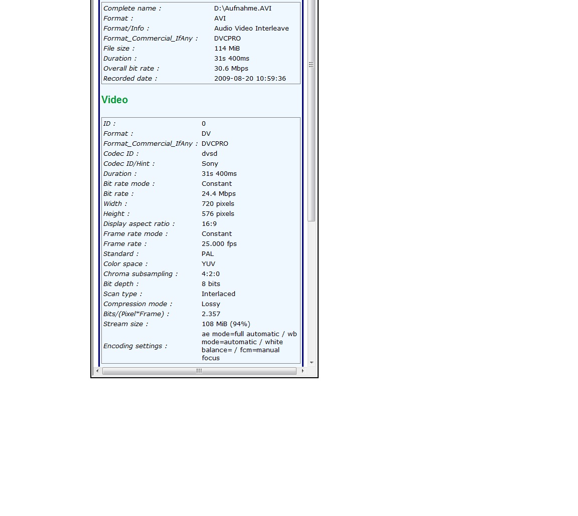 Konkrete Frage: Ich habe eine bestimmte AVI Datei, die ich beim Überspielen vom Camcorder auf meinem PC bekomme. Diese Datei möchte ich gerne über den Bluerayplayer C-5300 über eine externe Festplatte abspielen können. Geht das direkt, oder muss man diese Datei in ein andere Format umwandeln? Wenn ja, in welches, um es abspielbar zu machen und keinen Qualitätsverlust zu haben? Ich habe die genauen Daten der Filmdatei als Anhang angehängt. Vielen Dank!