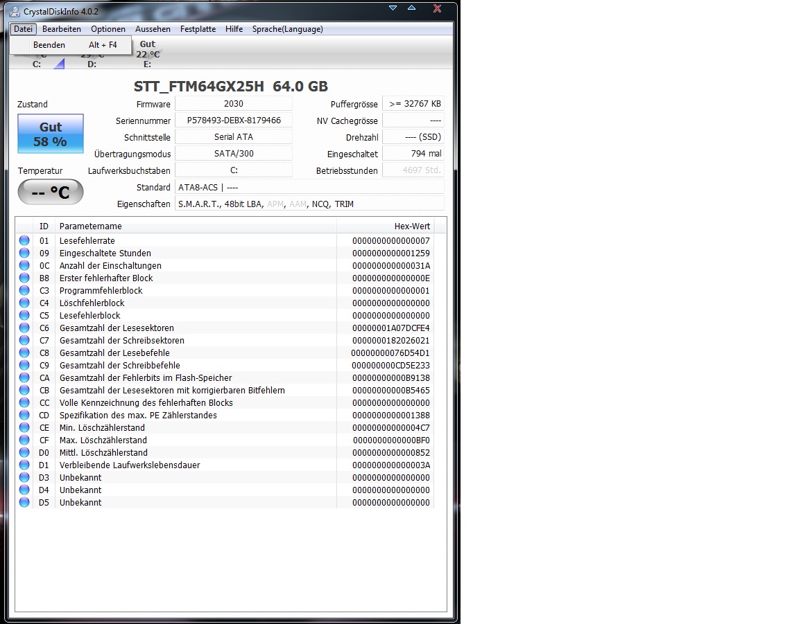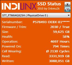 Die SSD ist jetzt ein Jahr alt, sie wird als Systemplatte genutzt mit W7. Ansonsten sind da nur die üblichen Programme drauf. Behandelt hab ich sie auch immer wie in verschiedenen Tutorials beschrieben (AMD SATA AHCI, keine Defragmentierung, etc.).