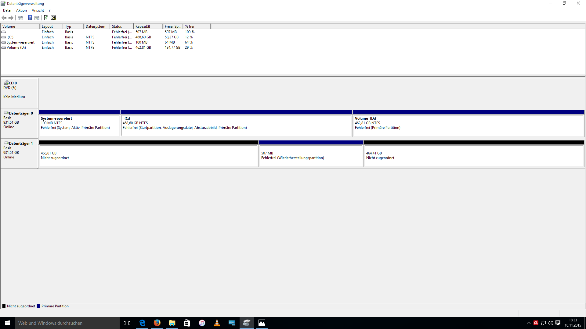 Ich habe bereits die Festplatte komplett formatiert,unter der Datenträgerverwaltung von Windows 10 habe ich jedoch keine Möglichkeit gefunden die beiden Volumes zusammenzuführen.