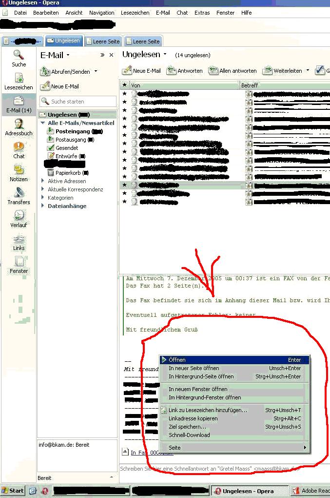 ich brauche einmal eure Hilfe für ein Problem, dass sich mir beim Öffnen von Dokumenten mit dem Opera-Browser darstellt. Wenn ich ein Word-Dokument öffnen möchte, gehe ich nach einem Rechtsklick auf meiner Maus auf "Öffnen". Wenn ich dann aber auf die linke Maustaste drücke und auf das Öffnen des Dokumentes warte, warte ich vergeblich. Denn das Dokument wird nicht geöffnet. Statt dessen fragt der Browser mich, wohin ich das ausgewählte Dokument dann speichern möchte. Nun meine Frage: