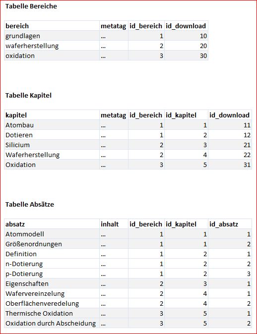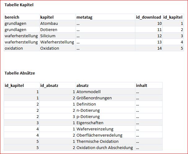 Ich denke mal #1 wäre eleganter, aber ich weiß nicht, ob eine Verknüpfung über die Kapitel-ID bspw. auch sinnvoll ist. Wäre das okay, oder sollte man das anders machen? Theoretisch könnte man die erste Tabelle ja nochmal in bereich und kapitel aufteilen:
