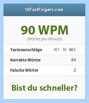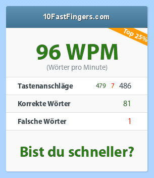 Ich bin also mehr als doppelt so gut, wie ich es sein müsste. Dennoch bin ich angefixt, ich muss jetzt die 100 WPM holen.