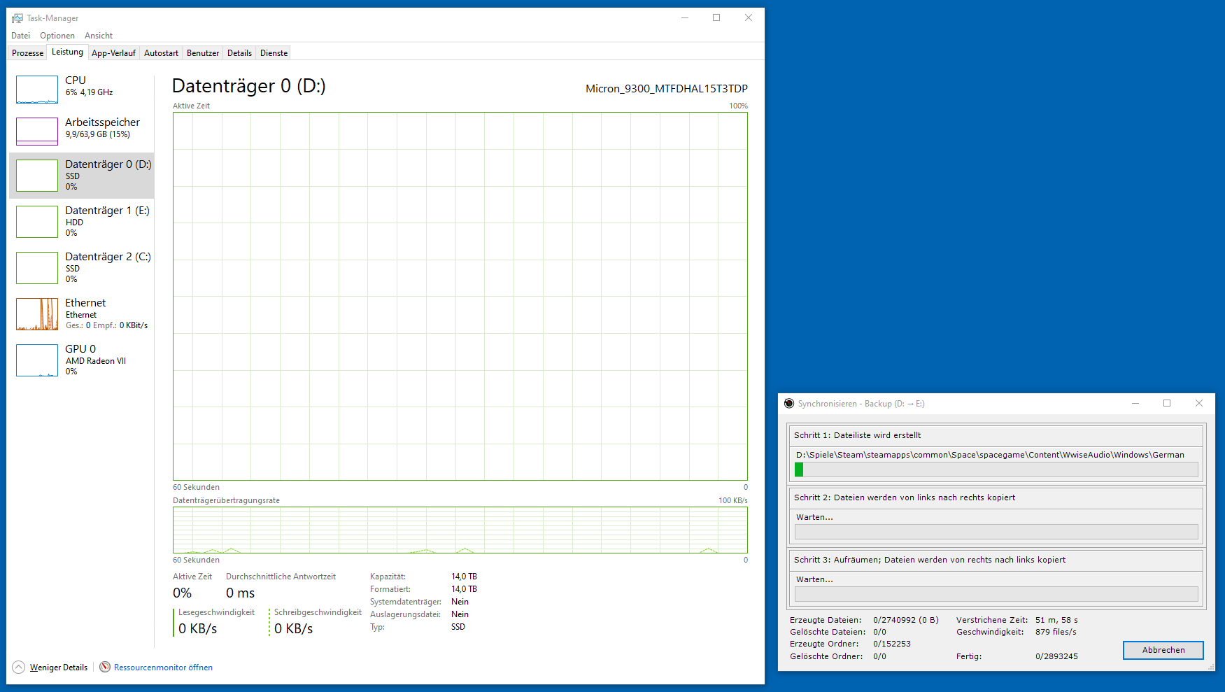 Hallo, ich möchte mich erkundigen, welche Möglichkeiten ich habe am besten automatisiert immer ein Backup zu fahren? Und zwar möchte ich alle 2-4 Wochen jeweils die aktuellen 7TB intern (im selben Rechner) von einer SSD auf eine HDD spielen. Bis heute habe ich immer von Hand die Backup-Platte schnellformatiert, alle laufenden Programme der SSD beendet und dann alles von Hand rüber kopiert. Am liebsten wäre mir eine möglichst simple Lösung, die dann auch auf dem Quell-Laufwerk nicht mehr vorhandenen Dateien auf dem Ziellaufwerk löscht. Und mir die Dateien direkt ansprechbar bereit hält, also kein *.img, *.iso oder *.bkp erstellt.