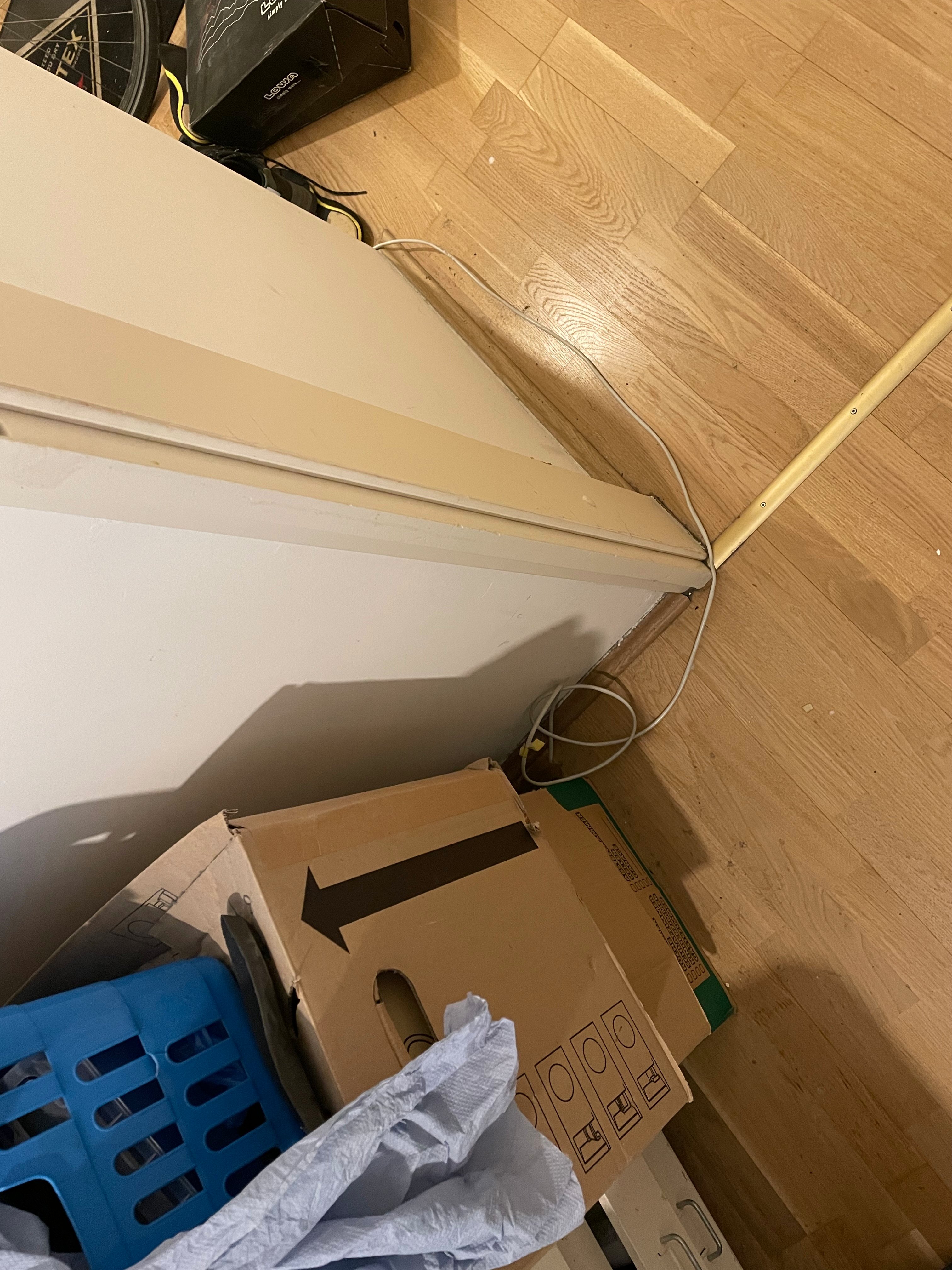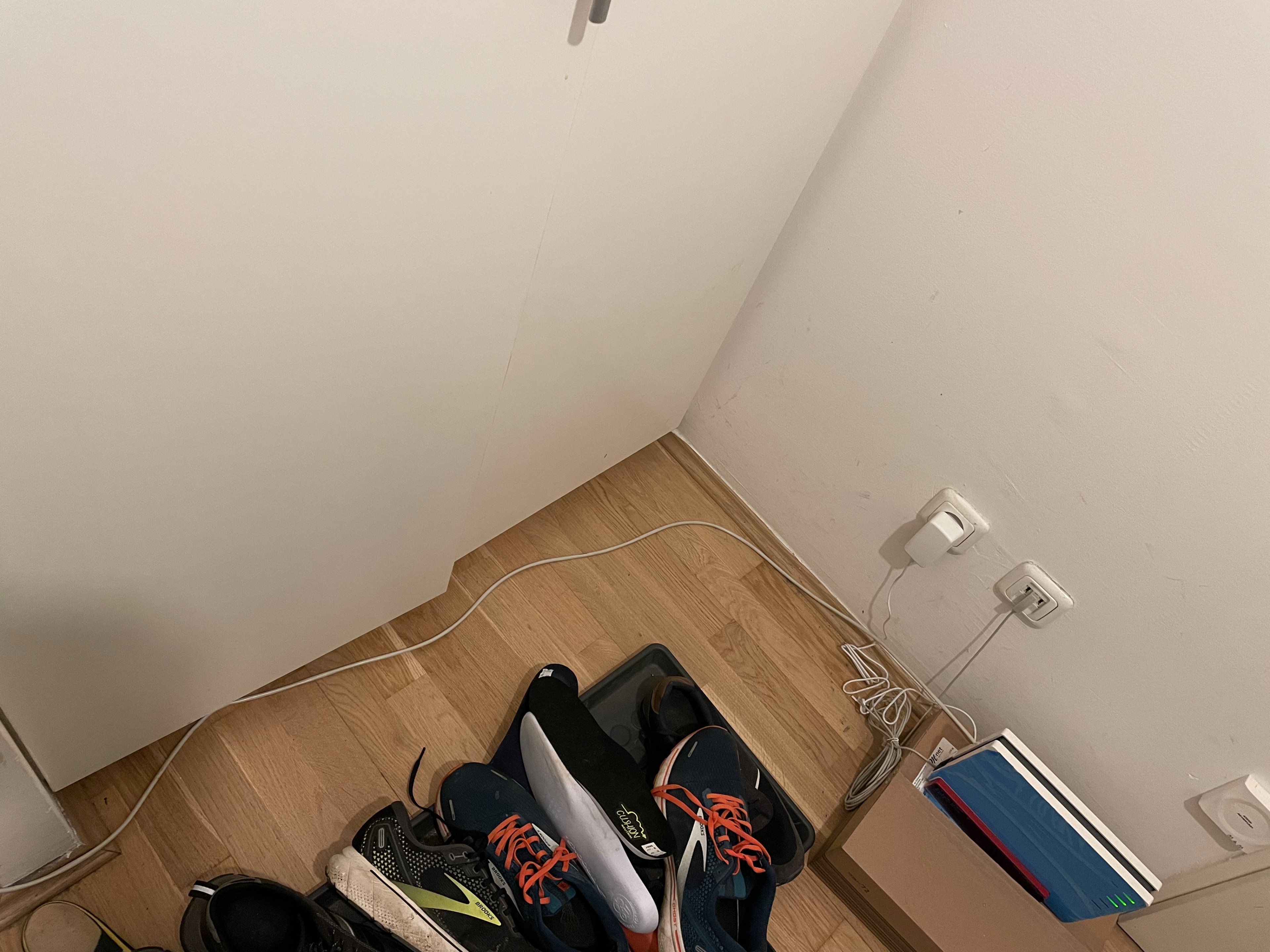 - es bräuchte nur ein etwa 10mm großes Loch durch die Rückwand des Schranks sowie der Wand sowie ein Loch im Holzboden des Schranks (wegen der Schranktür) sowie eines Leitungssuchers/finders