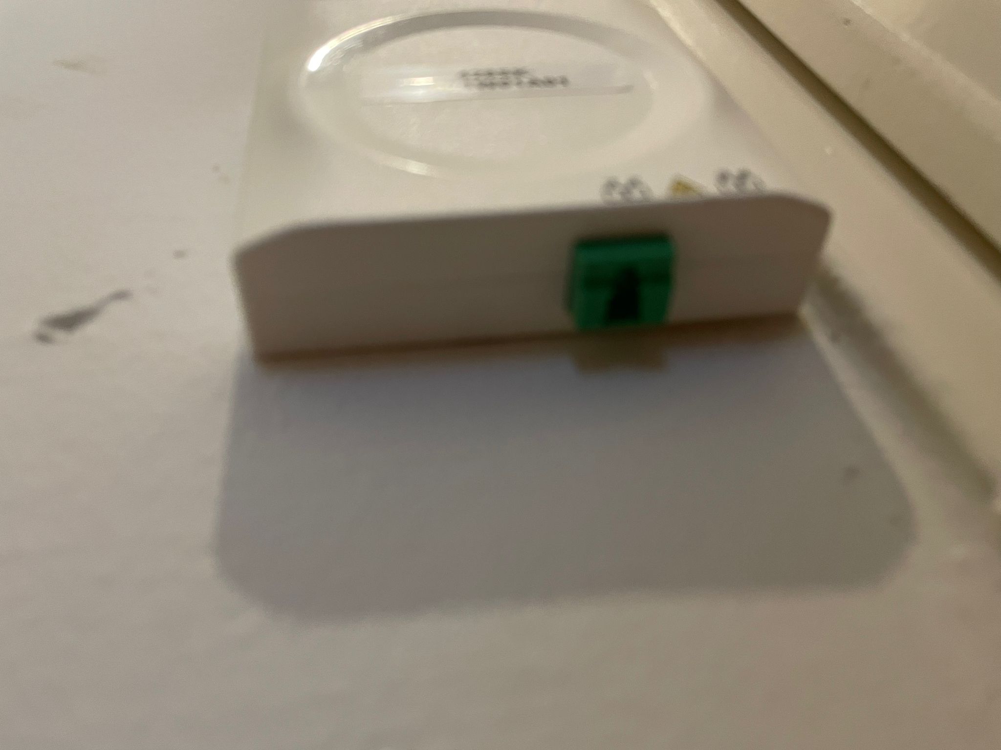 - bislang ist nur eine solche Dose angebracht (siehe Bild) worden, die für FTTH gedacht ist. Laut MNet nennt man diese UND. An dieser wird dann noch deren ONT (Glasfasermodem mit Anschlussmöglichkeit für CAT 7 LAN Kabel) angebracht