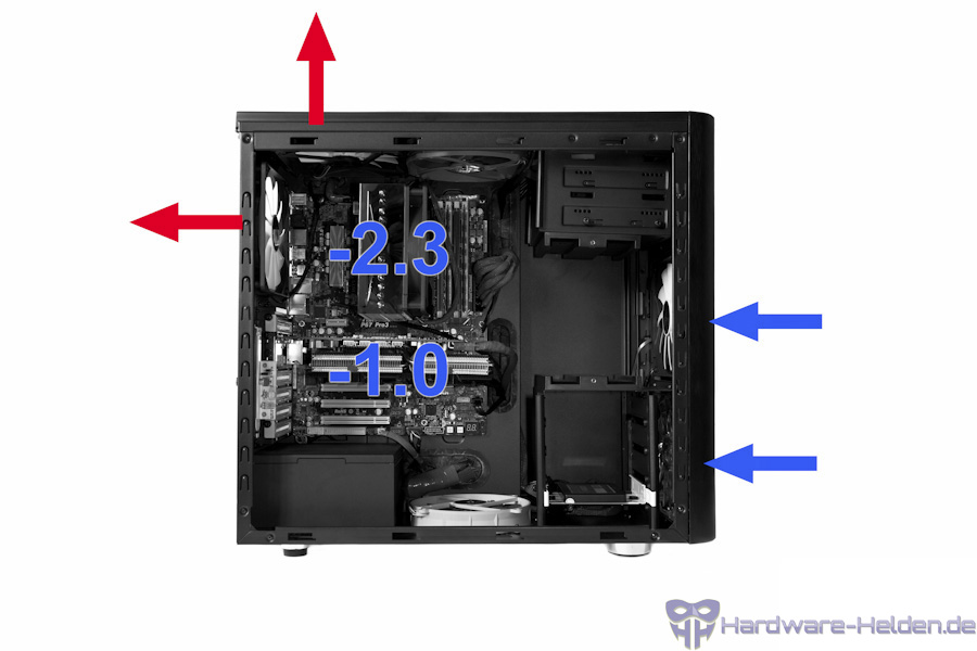 - 2x Front intake, 1x Oberseite outtake, 1x hinten outtake