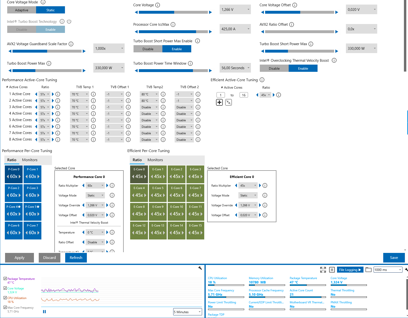 Aktuell läuft die CPU bei 50° mit kleines OC, alle P-Kerne laufen mit 5700 mhz und die E-Cores mit 4500mhz