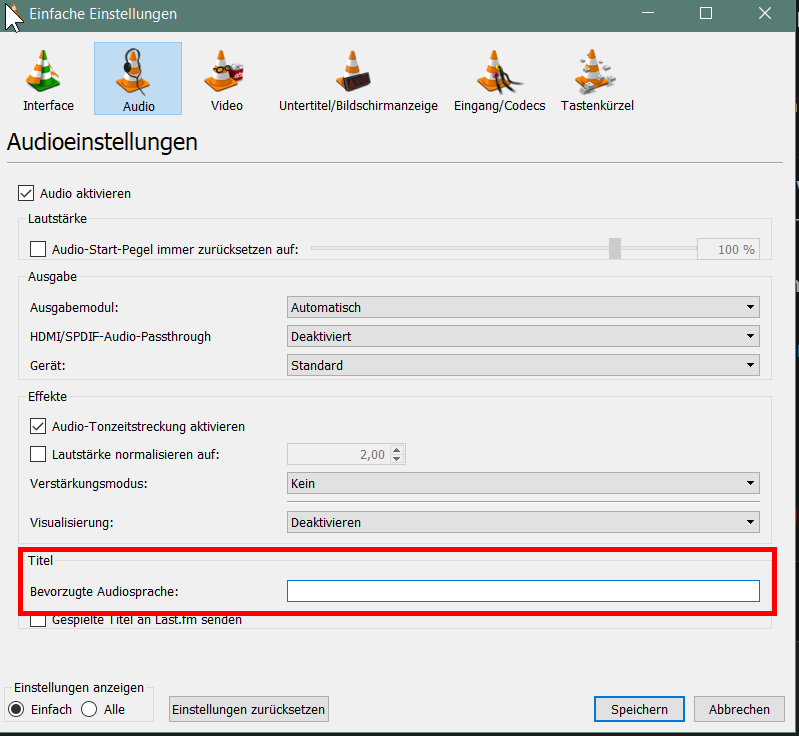 Es kann sein, dass mit der MakeMKV-Integration die BluRay-Menüs nicht vernünftig laufen. Die Audio-Sprache sollte er sich merken, wenn Du unter "Werkzeuge" --> "Einstellungen" öffnest, dann oben "Audio" auswählen und da, wo ich markiert habe, "DE" einträgst und dann speicherst.