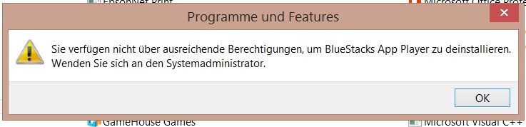 Warum wird beim deinstallieren über der Systemsteuerung als Administrator vom Programm Bluestacks, diese Meldung (siehe Screenshot) angezeigt , wenn man mit mit IO Bit Uninstaller löscht, wird wenn man es neu installieren will angezeigt : Bluestacks ist schon auf dem System installt , was muss man machen um es wird auf dem selben System zu installieren?