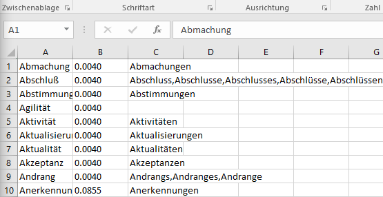 Ich habe eine Excel Datei(SentiWS Sentimentwörterbuch für die Deutsche Sprache) Kurze Erklärung: Für jedes Wort wird angegeben, wie positiv(0,1] oder negativ [-1,0) es ist. Das Format ist folgendermaßen. In der ersten Spalte steht das Wort in Originalform, in zweiter Spalte dessen Wert und in dritter Spalte die unterschiedlichen Formen des Wortes aus der ersten Spalte