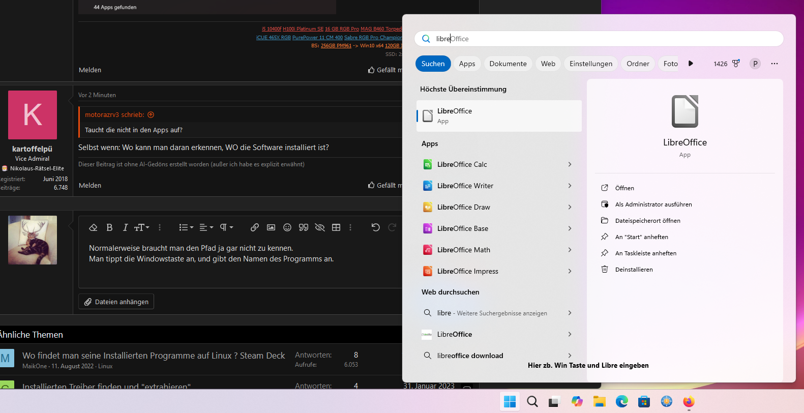 Mein zweiter Beitrag galt dem Screenshot von "installierte Apps" aus #9. Da macht Rechtsklick gar nix und es gibt nur Option für Uninstall oder Modify auf den drei Punkten.