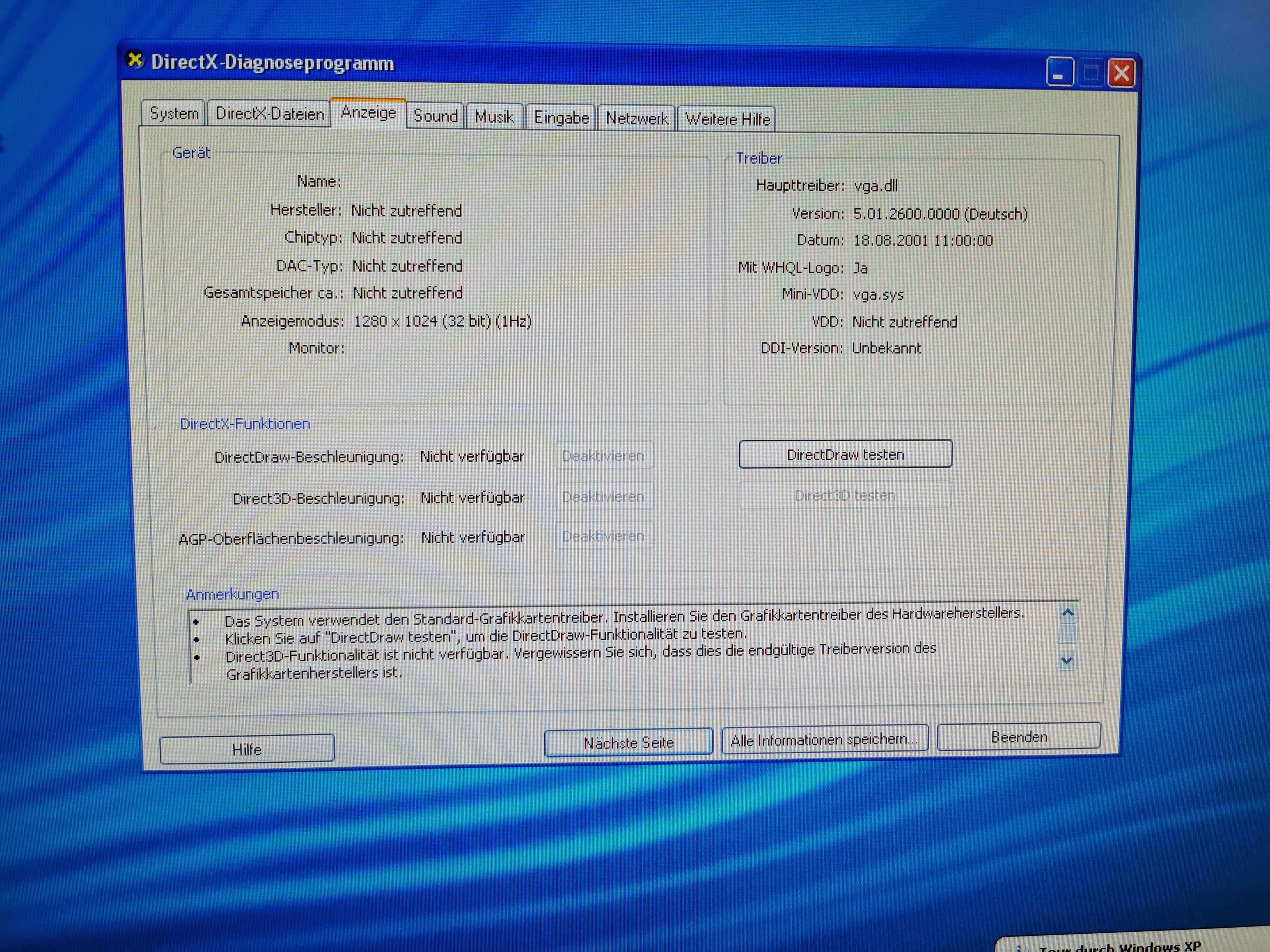 Nun wollte ich einen Treiber für die Grafikkarte installieren, weiss aber nicht welches Model es ist bzw welcher hersteller, und aus dem DirectX-Diagnoseprogramm geht keine info hervor. Nun wollte ich fragen, ob ihr wisst, wie ich in Erfahrung bringen kann, welche Grafikkarte ich eingebaut habe und welchen Treiber ich dementsprechend brauche. Sollte jemand Bilder brauchen lade ich sie gerne hoch.