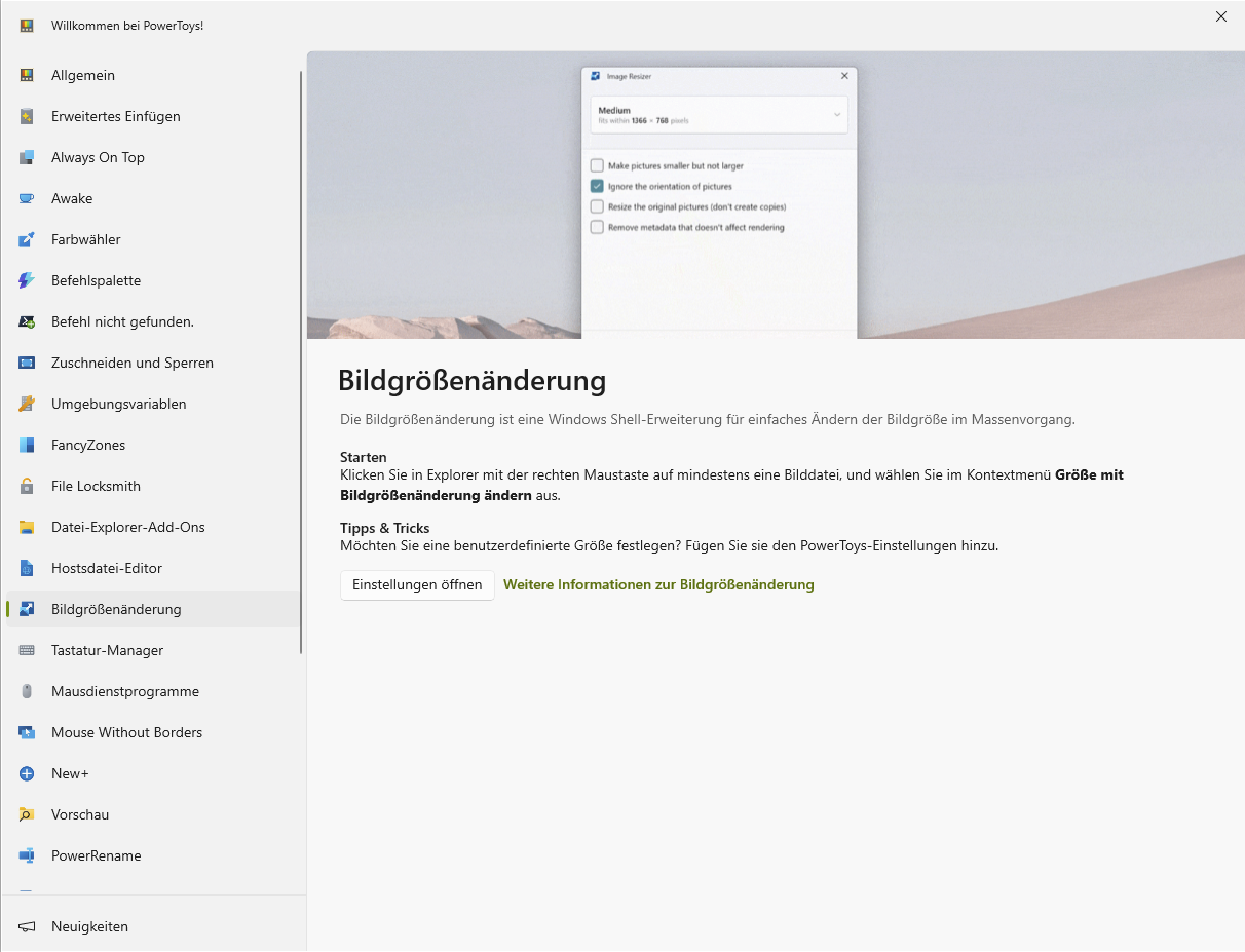 Asche über mein Haupt, trotz Eurer Mühen bekomme ich Power Toys "Resize Piktures " nicht runter geladen, trotz aller guten Hinweise. Finde den Einstieg nicht dazu. Nur die Erläuterung, wie es funktioniert, wenn installiert. Will nur dieses Hilfsprogramm. Darf ich noch einmal darum inständig bitten, mir eine bessere Hilfestellung zu geben? Mein Wissen ist viel zu gering. Auch wo ich mich anmeldun soll und muss, wie das geht, weiß ich nihct. Hatte einen bereits eingerichteten PC gekauft und einfach damit los gearbeitet. Bei Programmupdates, die installiert sind, da habe ich keine Probleme, weil as fast schon automatisch geht.