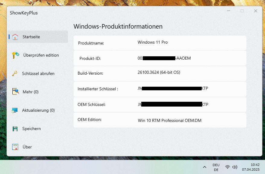 Wie hier aber schon angesprochen .. dürfte der Key sich im BIOS befinden.