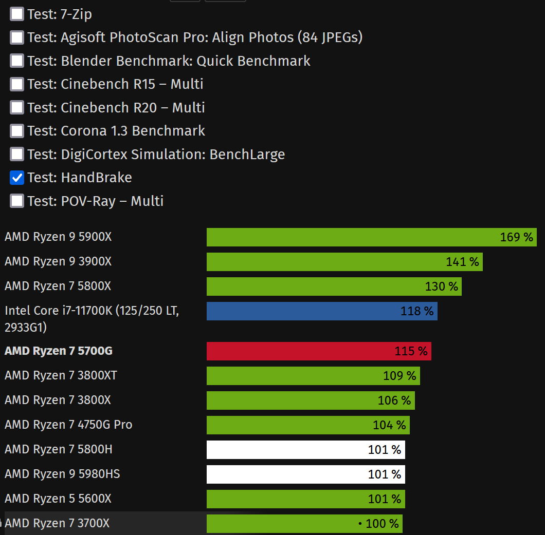 Hi ja die Frage ist ernst gemeint.Ich habe leider nur die Ergebnisse vom Ryzen 7 5800H mit 45 Watt und 3,2 ghz vorliegen.Ich bin mir noch nicht ganz sicher was von den 3 CPUS nun besser ist oder schlechter.Hat wer von euch einen Ryzen 7 5700G und kann was dazu sagen und auch was testen.Denn ich kann mich leider nicht zwischen den 3er entscheiden.Ich weis nur als wer da was getestet hatte dann brach die Leistung ein.Ich weis das Videoumwandeln wirklich gut Paralelliesierbar ist.Bei 2 Instanzen gleichzeitig brach auch die leistung massiv ein weil jeder Software nur noch 4 Kerne zur Verfügung hat.Macht es da überhaut einen Unterschied dann welchen der 3 CPU ich dann verwende oder bricht das bei z.b einem Ryzen 7 3700x dann weniger ein als bei einem Ryzen 7 5800H?