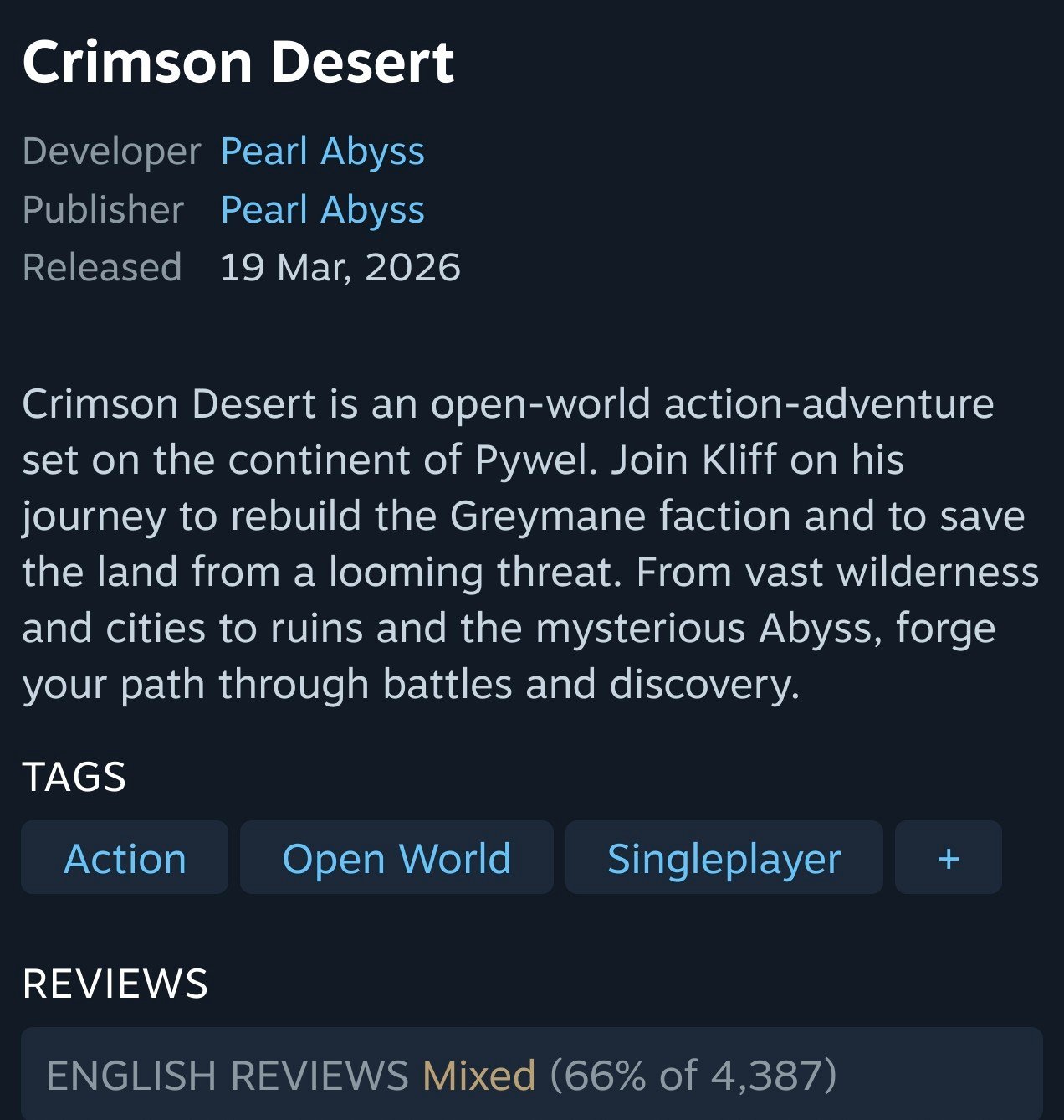 Werde ich mir bestimmt irgendwann holen aber aktuell bin ich noch mit WoW beschäftigt und auf dem Pile of Shame liegen auch noch so einige Dinge wie AC Shadows, Baldurs Gate 3, Claire Obscure und dann kommen dieses Jahr noch das Gothic Remake, Forza Horizon 6 und Tomb Raider raus denen ich aufjedenfall den Vorzug gebe. Also ich glaube dieses Jahr wird das mit Crimson Desert nichts mehr 😂