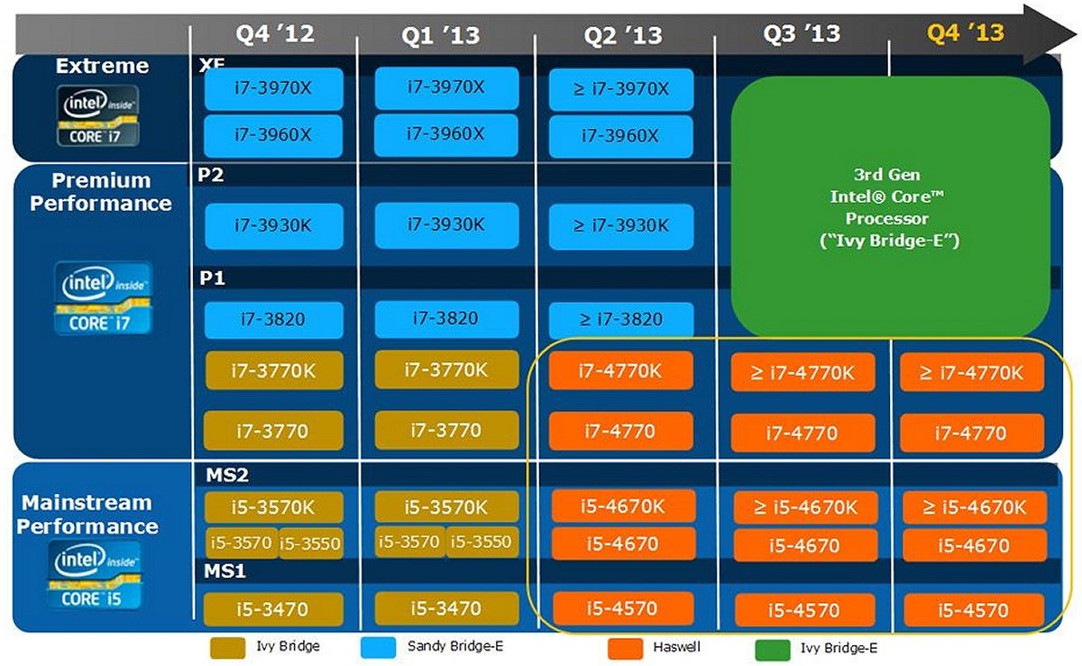 Bei den "großen" CPUs herrscht noch etwas Rätselraten. Aktuell weiß man wohl, das IvyBridge-EX CPUs einen neuen Sockel bekommen, der auf jedenfall inkompatibel zu aktuellen Sockel2011 Platinen ist. Evtl. kann er dafür auch die Nachfolgegenerationen (Haswell-EX und Broadwell-EX) aufnehmen, und sowohl DDR3 als auch DDR4 unterstützen.