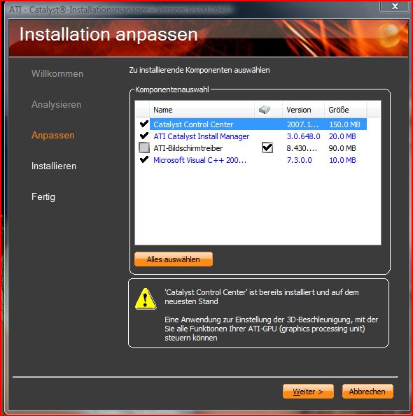 Ich habe für den Display Driver den Treiber geladen, kann den aber nicht installieren bzw wird nichtmal angezeigt nur der Installationsmanager von ATI ist bereit installiert zu werden. Hatte ich alles gemacht und gedacht ich könnte den Treiber danach installieren aber nichts passiert.