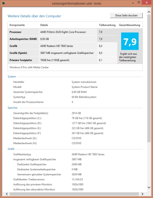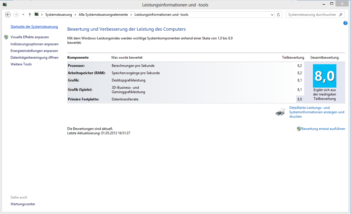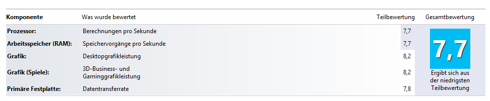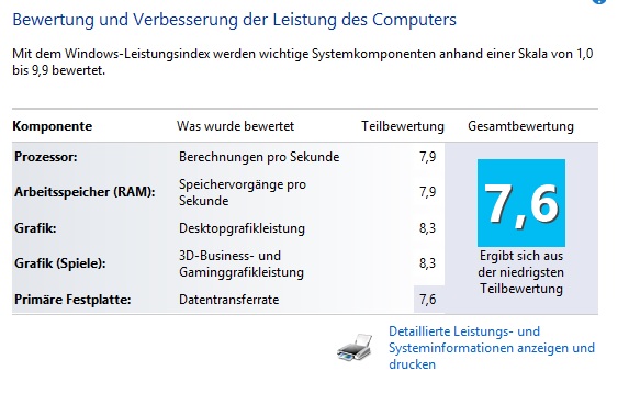 Wenn man ehrlich ist sagt der Leistungsindex doch gar nichts aus, habe unter Windows 7 alles auf 7,9 bis auf die CPU, die hat nur 7,8, unter Windows 8 hat sie 8,1, denke der neue Scheduler macht sich da bemerkbar, gefühlt finde ich die FP Perfomance unter Windows 7 schneller, auch das kopieren fühlt sich unter Windows 7 schneller an.