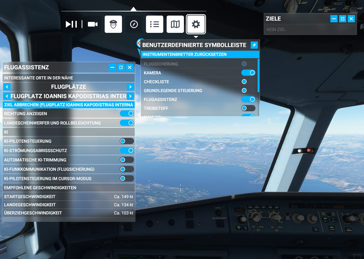 Fliegst Du da irgend ein vordefiniertes Szenario? Ich habe deutlich mehr Optionen im Auswahlmenue im Sim selber, Du hast ja "nur" 7 Stück. Die Kachel für den Flugfunkt fehlt Dir aus unerklärlichen Gründen, die würde aussehen wie ein stilisierter Tower und wäre im eingeblendeten Band ganz links.