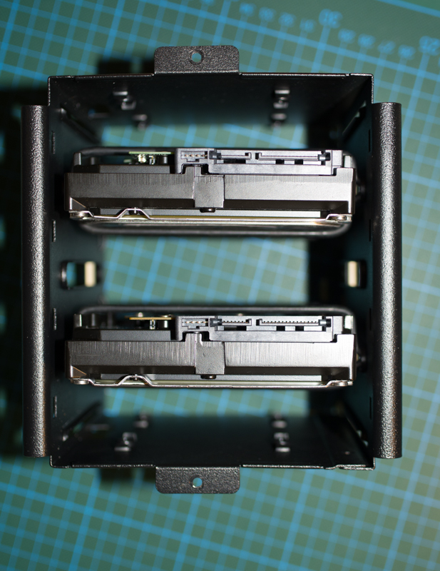 Bild 1: Festplattenkäfig von vorn, mit 2 zwischen Gummiringen gespannten 3.5" HDD (beide 7200er)