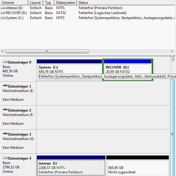 auf meiner externen 3 TB Platte konnte ich bisher den gesamten Platz nutzen (Vista 32 bit), etwa 1 TB Daten sind drauf. Nun wollte ich (blöderweise) ein 2. Volume auf dieser Platte einrichten, habe also den Platz verkleinert, so dass ich 600 GB nicht zugeordneten Platz bekam. Aus diesem wollte ich dann ein "neues einfaches Volume" erstellen, geht aber nicht (nicht anwählbar).