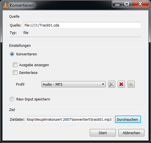 Vielen Dank für Eure Beiträge. Mit dem Mediaplayer kann ich eine wav-Datei speichern. Mit dem Vlc player funktioniert es trotz mehrfacher Versuche nicht (Anleitung:http://praxistipps.chip.de/vlc-player-datei-in-mp3-umwandeln-so-gehts_37028)