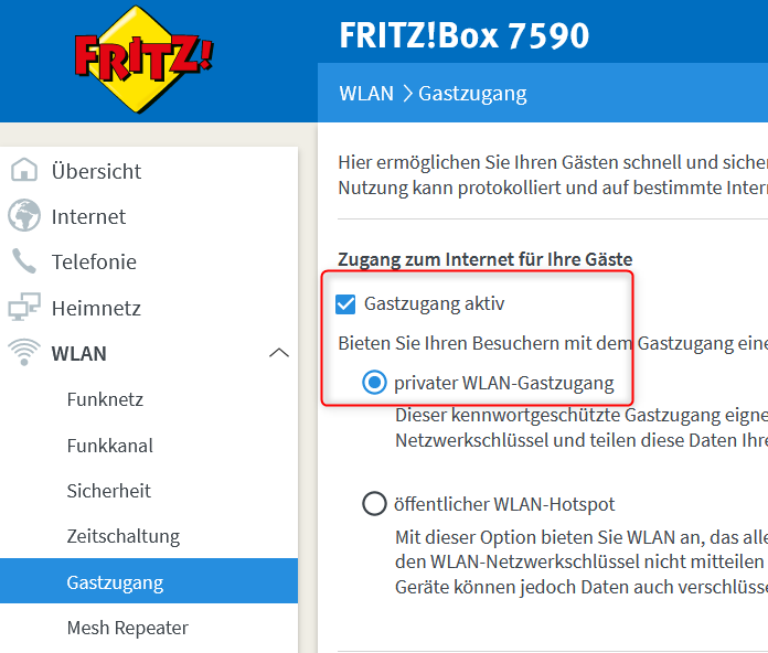 Bei mir zuhause habe ich eine FritzBox 7590, die als DSL Modem arbeitet. Mit einer FritzBox 7530 habe ich ein Mesh Netzwerk aufgemacht (die beiden Boxen sind über WLAN gekoppelt).