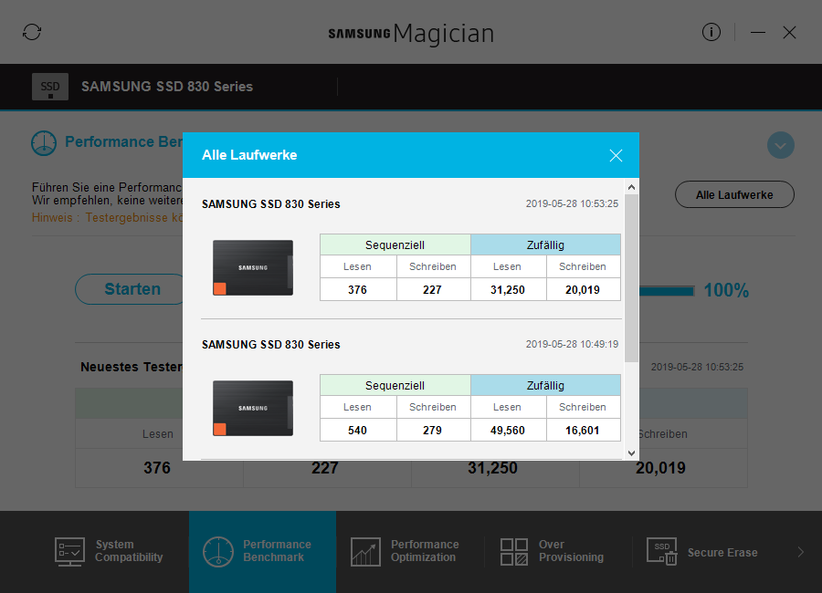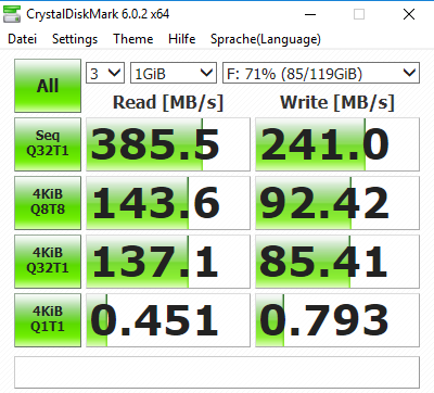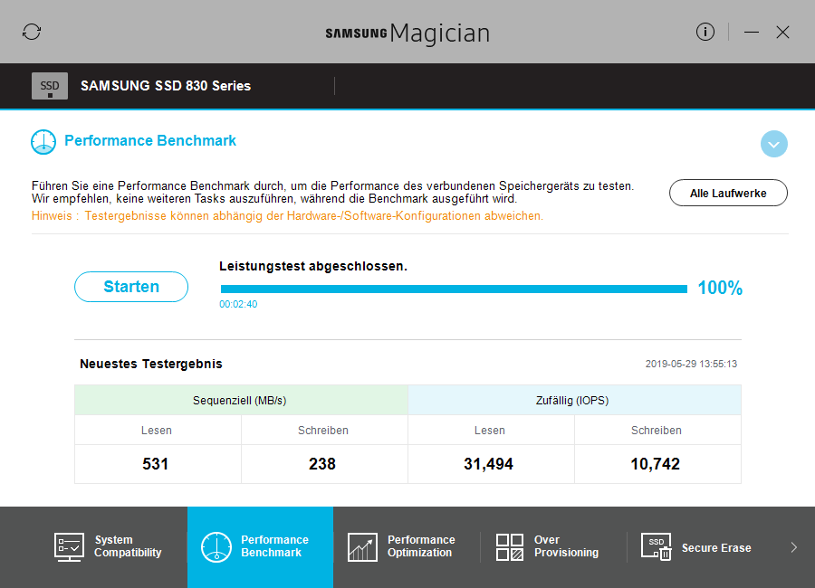 Eine Performance Benchmark mit dem Samsung Tool Magician hat bei den Sequenzillen Lese- und Schreibwerten Werte ergeben, die denen eines SATA 2 Anschlusses gleichkommen.