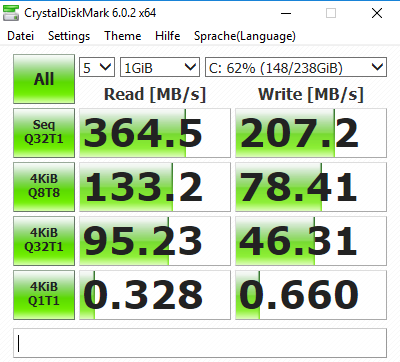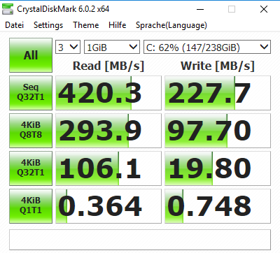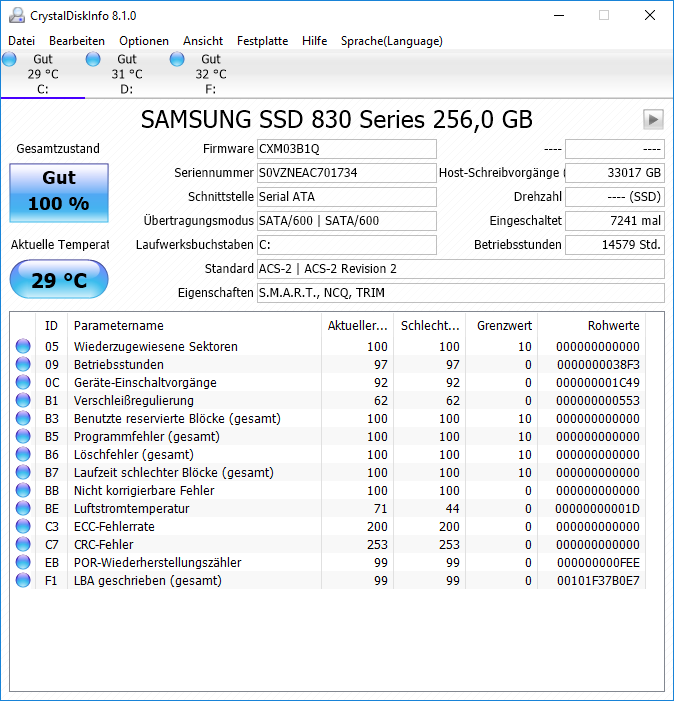 Bleibt noch zu klären warum die SSD's derart schlecht performen. Selbst auf SATA2 Ports sollte da erheblich mehr rauskommen als das was der userbenchmark gemessen hat - wird ja auch durch den Samsung Speedtest zum Teil bestätigt. Bitte nochmal dem Vorschlag von @rumpel01 nachkommen und einen Screenshot vom CDM nachreichen. Im gleichen Atemzug wäre auch ein Screenshot von CrystalDiskInfo interessant, bitte da das Fenster so weit aufziehen, dass alle Werte sichtbar sind.