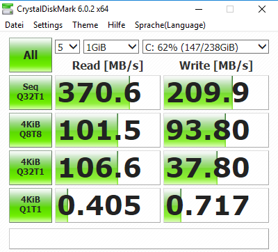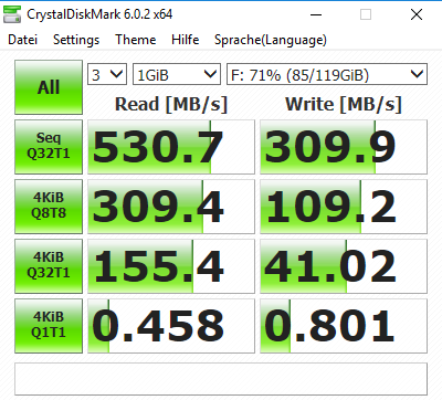 Beide stecken jetzt in den SATA Ports. CrystalDiskMark Ergebnisse sehen auf jeden Fall schon mal besser aus.