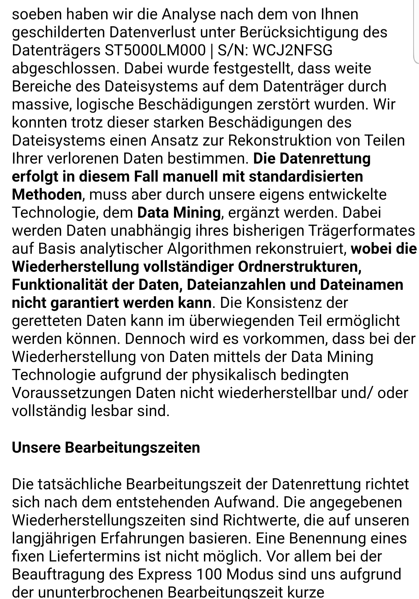 Das halte ich für pures Marketing. Durch das Auslesen der Restmagnetisierung lassen sich allenfalls einzelne Bits rekonstruieren. Ich bin beruflich mit Datenwiederherstellung beschäftigt. Logische Beschädigungen (wie gelöschte Dateien oder eine gelöschte Partitionstabelle) kann ich mit meinen Tools bearbeiten. Je exotischer das Dateiformat der wiederherzustellenden Dateien ist, umso geringer ist die Chance etwas brauchbares zurückzubekommen. Die Dateigröße spielt ebenfalls eine Rolle. Kleine Dateien lassend sich besser wiederherstellen als große.julian 13 schrieb:ch habe heute bestätigt bekommen das Datarecovery in Leipzig die Restmagnetisierung ausließt und sogar überschriebenes bis zum einem bestimmten Grad rekonstruiren kann wenn etwas nicht zu sehr beschädigt ist zu viele Informationen fehlen dann können überschriebene Strukturen repariert werden