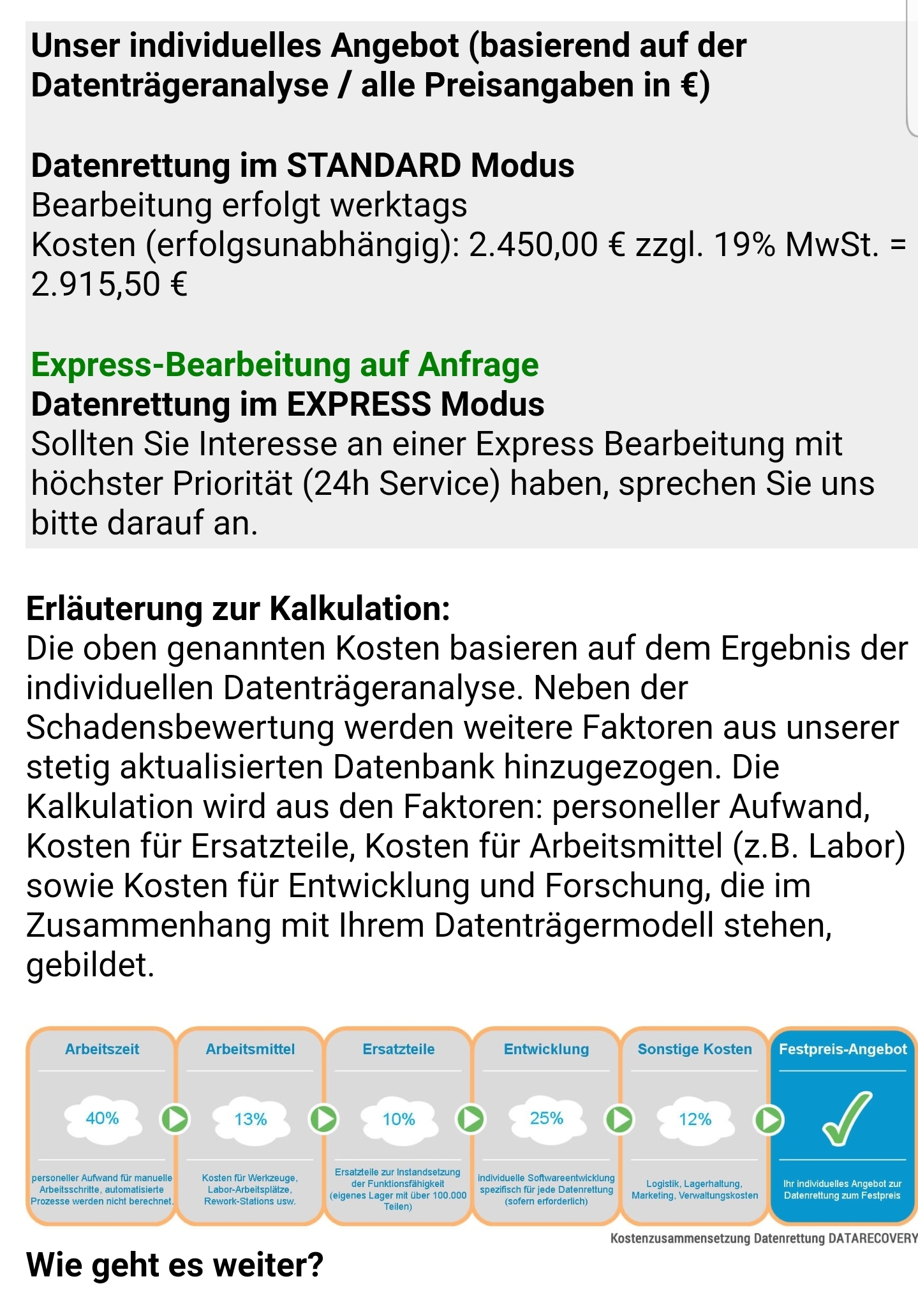 Das heisst selbst wenn sie bedauerndswerterweise nur Muell wiederherstellen koennen musst du blechen.