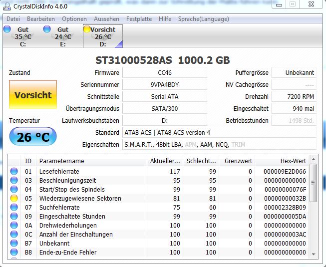 Ich bekomme langsam Probleme mit meiner 1TB-Platte von Seagate. Crystal Disk Info mahnt zur Vorsicht. Die SeaTools finden aber nichts, der Langzeitoberflächentest war ok.