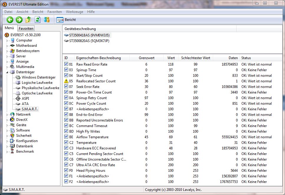 05 Reallocated Sector Count 36 100 100 1 OK: Wert ist normal