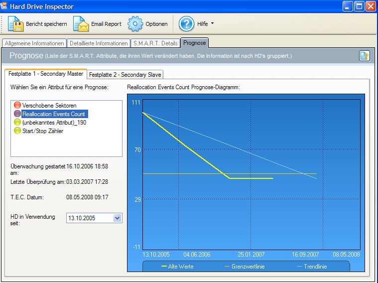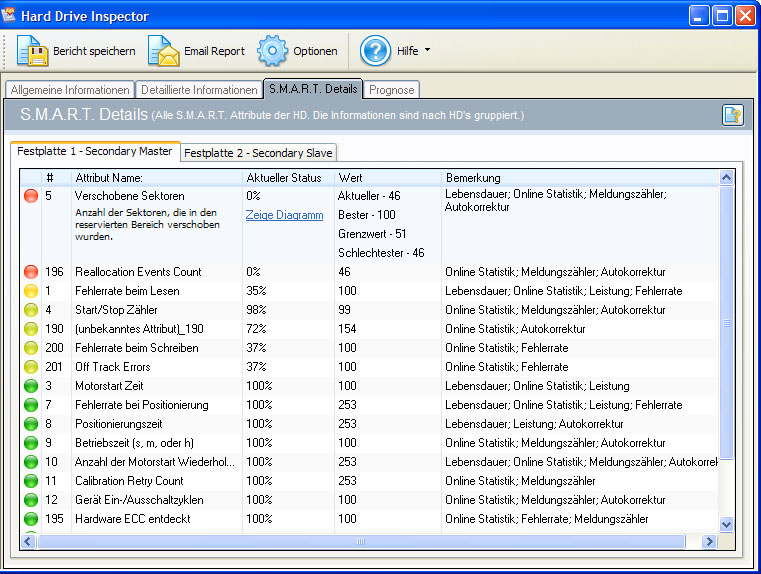 Um das zu überprüfen habe ich Hard Drive Inspector gestartet und dort wurden die folgenden Attribute rot angezeigt: