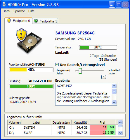 Ich habe heute zufällig HDDlife Pro gestartet und war ganz geschockt, dass bei meiner gut 2 Jahre alten Samsung SP2504C der Funktionsfähigkeitswert nur noch bei 40% liegt.