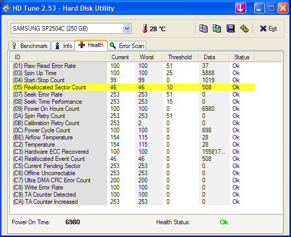 Dann habe ich HD Tune gestartet und dort ist der Wert Reallocated Sector Count gelb unterlegt.