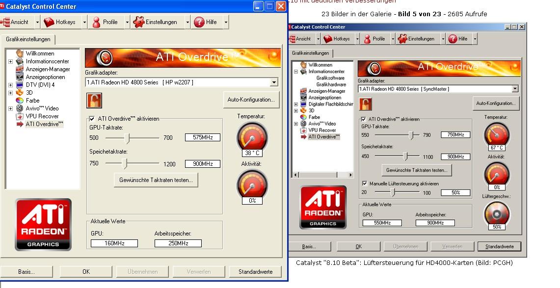 Habe gelesen dass man im CCC den Lüfter runterregeln kann aber ich finde das nicht. Bzw. frage ich mich ober das überhaupt geht bei mir, denn GPU-Z meint er dreht ohnehin kaum. Allerdings ist er sehr laut, viel lauter als meine alte X1950PRO von Asus, deswegen kann ich nicht ganz glauben dass dieser Wert stimmt.