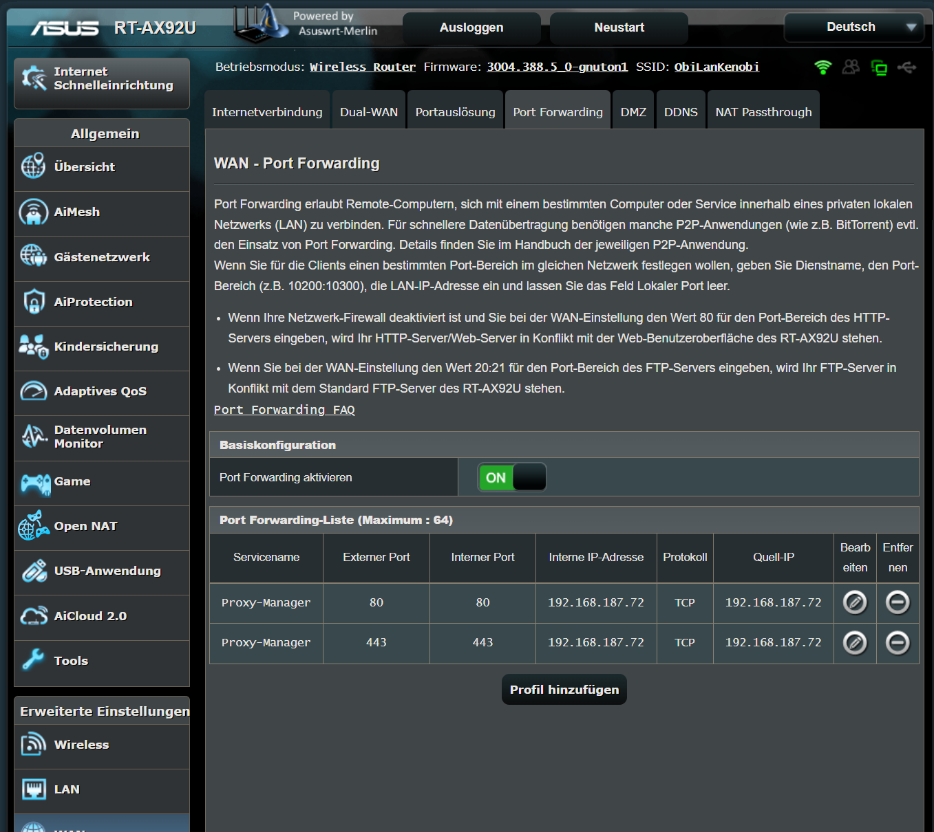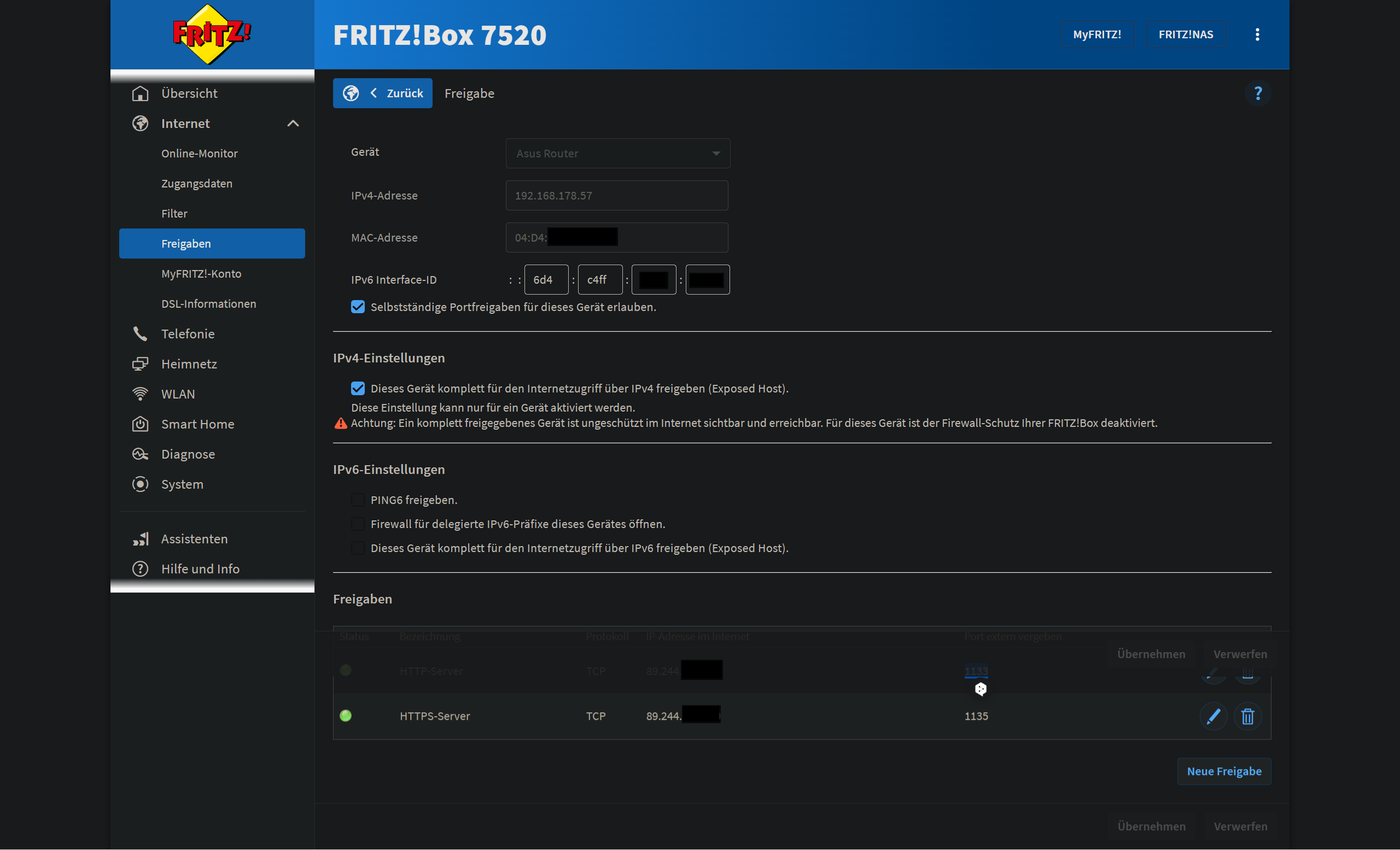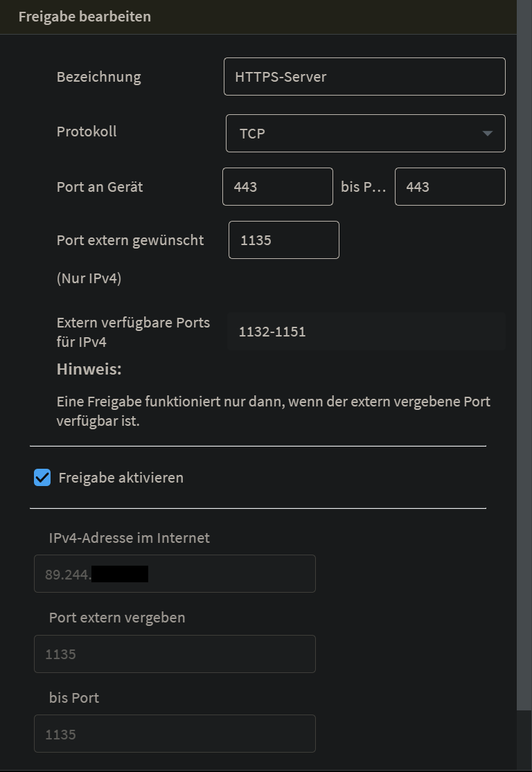 Aktuell hab ich meinen Router als "Exposed Host" in der Fritzbox markiert in der Hoffnung das dies was verändert. Ich habe auch in der Fritzbox für den Router "Selbstständige Portfreigaben" aktiviert, dass falls ich einen Port übersehen hätte, der Router noch ne Chance hat trotzdem den Port zu öffnen. Außerdem sind in der Fritzbox die Ports 80 und 443 für den Router geöffnet und im Router (Asus Router) hab ich ebenfalls die Ports 80 und 443 für den Proxy Manager geöffnet.