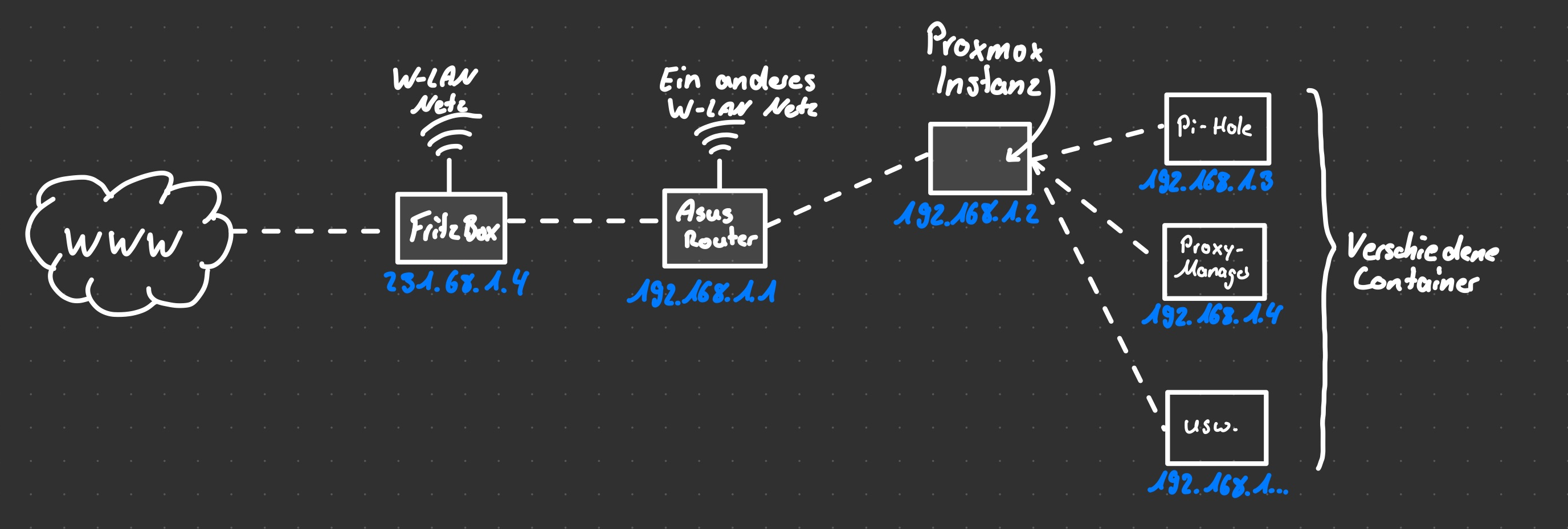 Ich habe eine Fritzbox die ganz normal als Router fungiert. Diese ist auch an dem Internet angeschlossen und ist für meine WG-Mitbewohner da. An dieser Fritzbox ist ein Router (Asus Router) von mir angeschlossen. Dieser hat ein eigenes Netzwerk über das meine Geräte verbunden ist. Somit kann ich bei mir im Netzwerk Sachen ausprobieren, ohne das ich das Netzwerk für die anderen beeinträchtige.