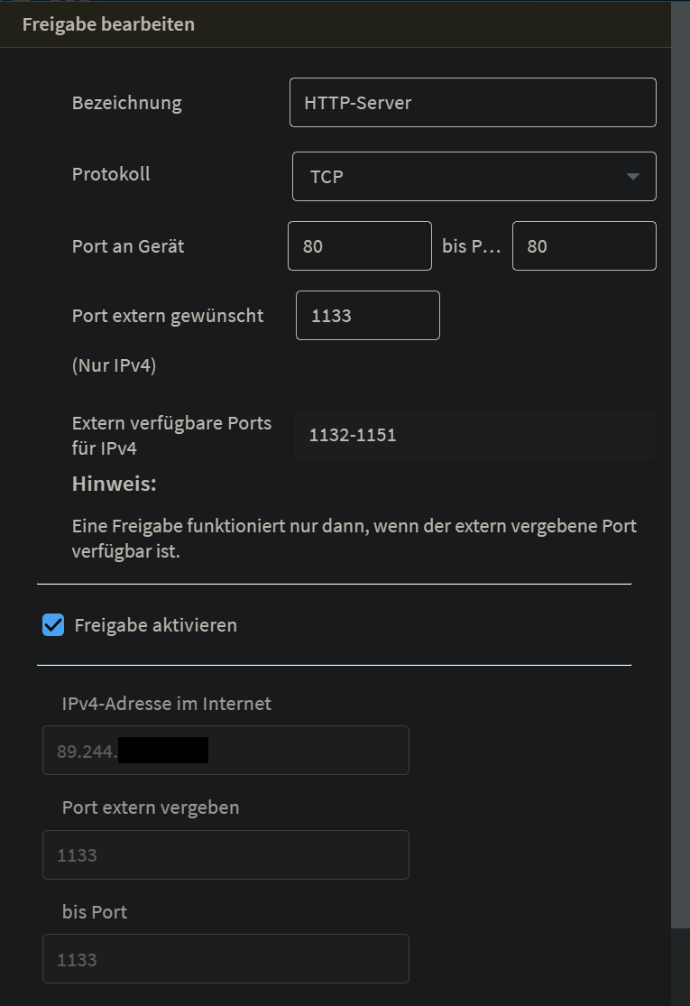 Testweise hab ich mal einen Container erstellt und nur einen Apache Webserver drauf laufen lassen. Hab dann im Asus Router im "Port Forwarding" Punkt die IP des Apache Containers eingetragen. Auch diesen kann ich von außen nicht erreichen. Intern im Netzwerk funktioniert dies jedoch.