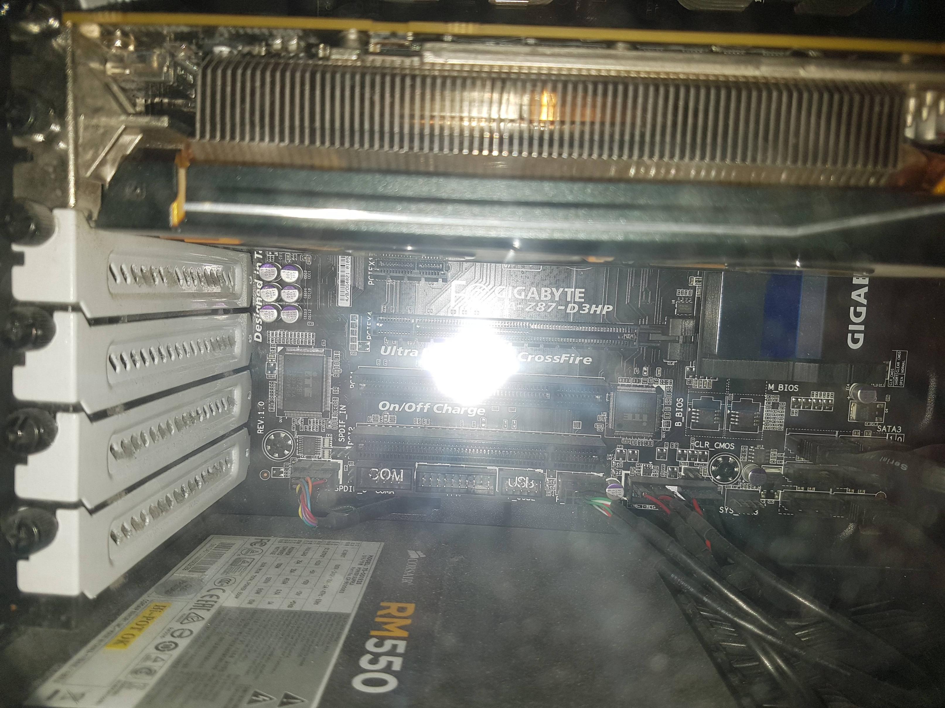 Ich habe auf dem Mainboard eine R290 Tri-X OC Grafikkarte installiert. Diese verdeckt leider die beiden "genau passenden" Ports für die Soundkarte, siehe folgendes Bild: