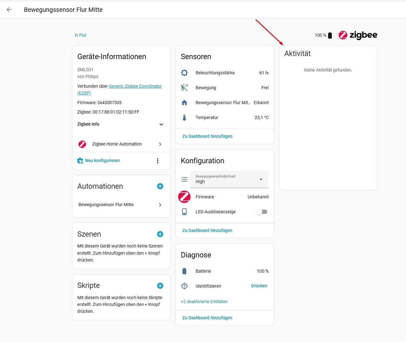 If the device is "online" but shows no state changes (motion, illuminance, temperature), forcing a re-configuration can fix it.