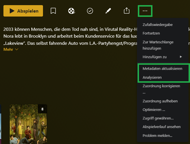 Bsp.: Ich habe was an einem Film oder Serien-Staffel, also der einzelnen (MKV-)Datei, geändert, dann gehe ich in Plex auf die Seite des Films oder der Serienstaffel und mache eine Analyse über die drei Optionspünktchen.